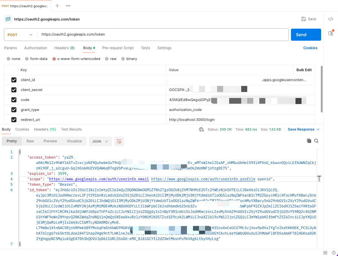 - 服务端使用这个 code 以及 client_id 和 client_secret 向 https://oauth2.googleapis.com/token 端点发起请求以获取 access_token 和 refresh_token。